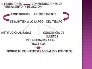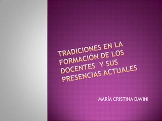 Este documento describe la evolución histórica de las tradiciones y discursos en torno a la formación docente en Argentina. Inicialmente, la formación docente se centraba en la homogenización e inculcación de conductas mediante un enfoque positivista. Más adelante, surgieron discursos críticos que cuestionaban esta visión y propusieron una pedagogía centrada en los contenidos y las relaciones de poder en la escuela. Recientemente, se promueve una formación docente basada en la actualización permanente, el anális