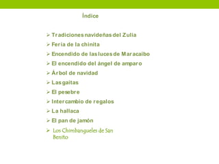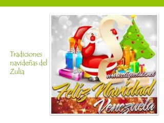En el estado Zulia, Venezuela, la Navidad se celebra más largo que en cualquier otro lugar, comenzando a finales de octubre. Algunas tradiciones importantes incluyen la Feria de la Chinita en noviembre, el encendido de las luces de la Avenida Bellavista a mediados de diciembre, y el encendido del Ángel de Amparo a mediados de noviembre. La gastronomía típica incluye hallacas, pan de jamón, pernil y sancochos. La música tradicional es la gait