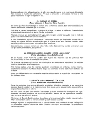 Este documento presenta varios relatos y tradiciones populares del pueblo de Cerro La Culebra. Algunas historias incluyen avistamientos de entidades sobrenaturales como un caballo sin cabeza, un hombre con dientes grandes, y un hombre con patas de gallina. Otras historias describen tradiciones locales como las fiestas anuales en honor a la cruz en el cerro y las creencias sobre el origen del nombre del pueblo. El documento también presenta anécdotas sobre cómo ha cambiado la vida en el pueblo con el tiempo.