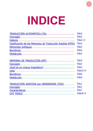 El documento describe la historia y diferentes tipos de traducción automática, incluyendo traducción basada en reglas, corpus lingüísticos y contexto. También explica conceptos como memorias de traducción, que almacenan información de frases traducidas previamente, y corpus lingüísticos, que son conjuntos de ejemplos reales del uso del lenguaje.