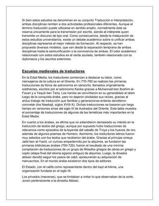Este documento describe la traducción e interpretación como estudios universitarios cuyo objetivo es formar traductores e intérpretes profesionales. Los estudios generalmente involucran el dominio de tres idiomas: la lengua materna, una primera lengua extranjera y una segunda lengua extranjera. También se discute brevemente la historia de la traducción en la Edad Media y el nacimiento de los estudios universitarios de traducción e interpretación en el siglo XX.