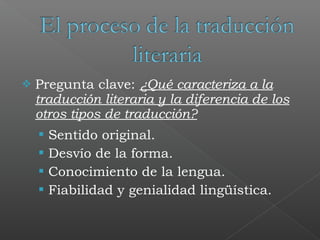 La traducción literaria requiere conocimiento profundo del sentido original y la forma del texto, así como habilidad lingüística y cultural. El traductor literario tiene responsabilidad tanto con el autor como con los lectores. Para especializarse en traducción literaria existen posgrados, cursos y seminarios. Aunque es una profesión mal retribuida, las tarifas varían según la editorial y el idioma combinación.