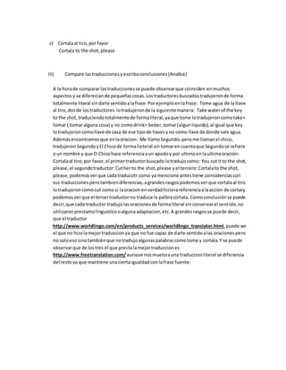El documento compara las traducciones de tres traductores en línea de tres frases del español al inglés. Los traductores tradujeron las frases de forma literal sin conservar el sentido, como traduciendo "llave" como "key" en lugar de "faucet". El documento concluye que mientras los traductores coinciden en algunos aspectos, también difieren y el tercer traductor fue el menos efectivo al no traducir completamente las frases o palabras.