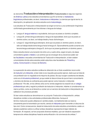 Los estudios de Traducción e Interpretación forman a mediadores lingüísticos profesionales como traductores e intérpretes. Generalmente se estudian tres idiomas: la lengua materna, una primera lengua extranjera y una segunda lengua extranjera. Estos estudios tienen entre uno y cuatro años de duración y se imparten en facultades universitarias de Traducción e Interpretación.