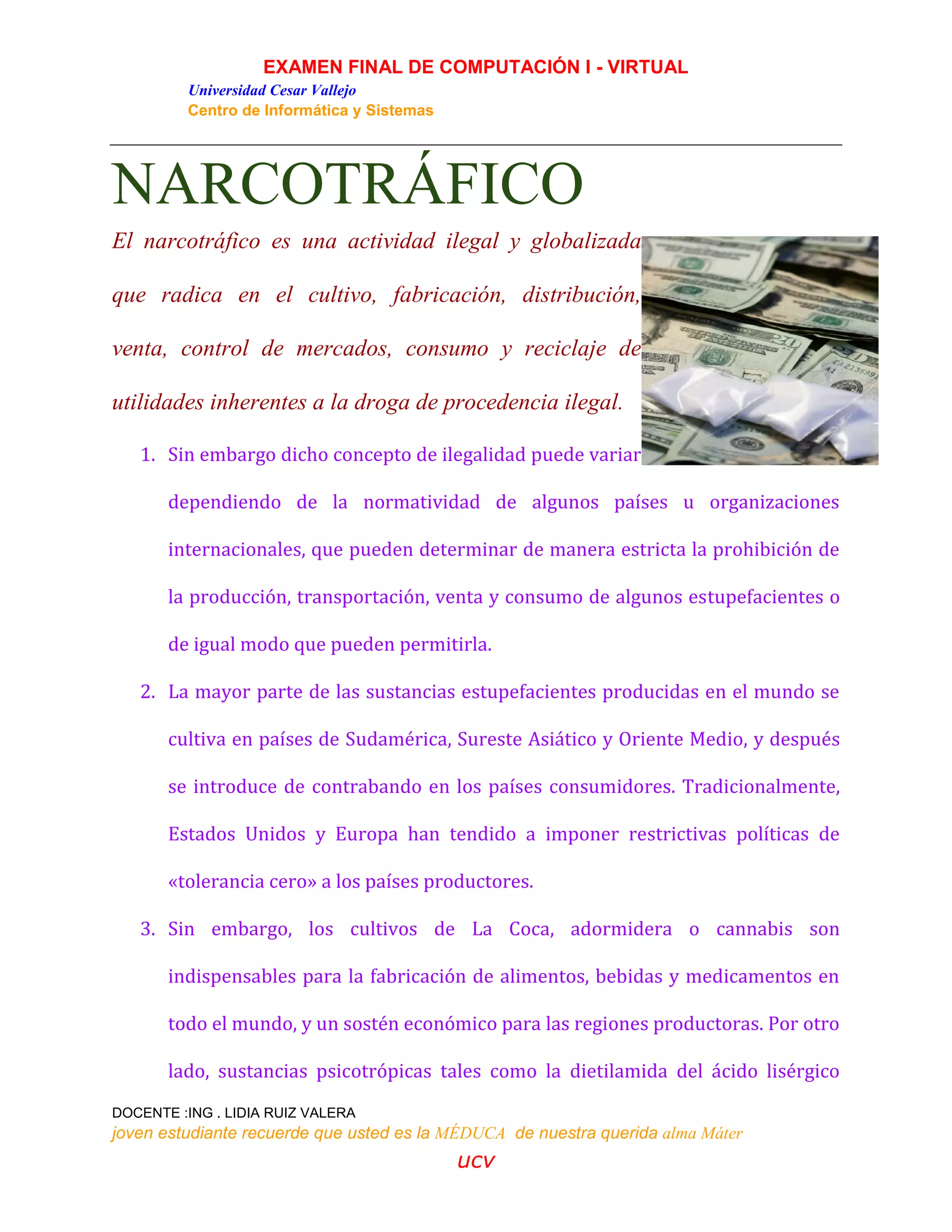 El documento habla sobre el narcotráfico y diferentes tipos de drogas. Explica que el narcotráfico involucra el cultivo, fabricación, distribución y venta de drogas ilegales y que aunque tradicionalmente se ha considerado ilegal, algunos países permiten ciertas drogas o sus usos. También describe brevemente los principales tipos de drogas como los hongos psicodélicos, alcohol, tabaco y sus respectivas regulaciones y mercados legales e ilegales.