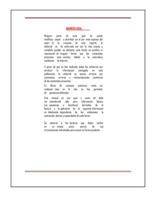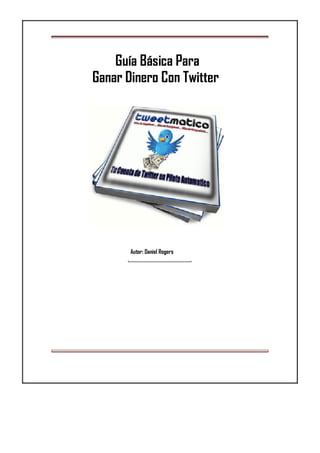 Este documento ofrece consejos para ganar dinero en Twitter. Explica que debes configurar tu cuenta con tu nombre real o marca, una biografía y URL que promocionen tu negocio. Además, recomienda publicar 10 tweets diarios de calidad que incluyan enlaces, comentarios y contenido valioso para generar seguidores interesados en visitar tu sitio web.