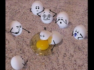El documento describe gráficamente una escena trágica donde un personaje principal cayó desde una gran altura y su cuerpo quedó gravemente dañado, con sus tripas expuestas. Las personas alrededor muestran expresiones de miedo y horror ante la escena. Concluye advirtiendo que si fuéramos tan frágiles como un huevo, no encontraríamos la escena graciosa.
