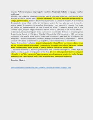 El documento de Sebastián Edwards señala que la educación en Chile es de pésima calidad, con graduados semiletrados y bajos niveles de comprensión lectora y conocimientos técnicos. A pesar de los esfuerzos por mejorar el sistema, se ha mantenido un debate estéril sin cambios significativos, y los resultados de la prueba PISA revelan que los estudiantes chilenos están rezagados en comparación con otros países. Se hace un llamado a reformular la discusión educativa hacia un enfoque más claro, reconociendo la importancia de la educación como un bien económico y derecho social.
