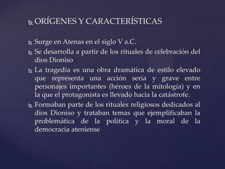 La tragedia griega surgió en Atenas en el siglo V a.C. como parte de los rituales religiosos dedicados al dios Dioniso. Se representaban obras dramáticas serias que trataban temas de la mitología y que ejemplificaban problemas políticos y morales de la época. Las tragedias se presentaban en concursos teatrales financiados por ciudadanos ricos y eran gratuitas para todos los atenienses.