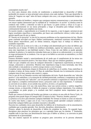 Este documento ofrece 21 estrategias para tomar decisiones rápidas y mejorar la eficacia profesional. En las primeras 3 oraciones, introduce el tema de tragarse el sapo, o enfrentar la tarea más importante primero, y cómo desarrollar este hábito puede llevar al éxito. Luego promueve planificar cada día con anticipación para poder empezar a trabajar en las tareas más importantes.