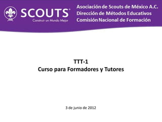 Este documento describe un curso de capacitación para formadores y tutores (TTT-1) que consta de 9 módulos. El curso busca desarrollar las competencias necesarias para que los formadores y tutores apoyen a los scouters y dirigentes en su propio desarrollo personal y profesional a través de oportunidades de formación presencial y en línea basadas en principios de andragogía.