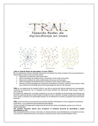 TRAL (Tejiendo Redes de Aprendizaje en Línea) es un proceso práctico para reconocer, analizar y fortalecer las redes personales y profesionales de una persona mediante el uso de herramientas tecnológicas, con el objetivo de enriquecer el ambiente personal de aprendizaje. Este proceso también propone estrategias para ampliar las redes y convertirse en nodos distribuidos en lugar de centralizados.
