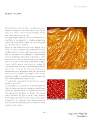 Este documento describe un estudio sobre el origen del color en las frutas cítricas como la naranja. Explica que el color anaranjado de la fruta se debe a las vesículas que contienen líquido dentro de su estructura interna. Al separar estas vesículas, se vuelve transparente y el color anaranjado intenso disminuye. Luego, el documento propone crear nuevas tramas colocando las vesículas de manera individual o combinándolas con otras frutas para generar una variedad de colores.
