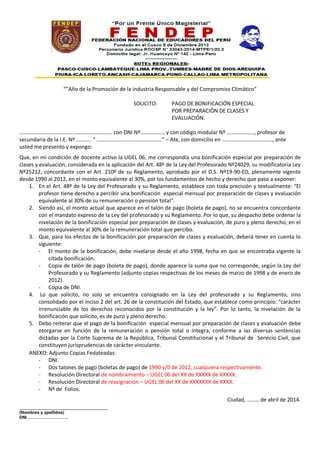 El profesor solicita el pago de una bonificación especial del 30% de su remuneración total, de acuerdo a la Ley del Profesorado. Argumenta que la bonificación por preparación de clases y evaluación establecida en la ley no concuerda con lo que recibe actualmente en su boleta de pago. Adjunta documentación para respaldar su solicitud y afirma que el pago de la bonificación es un derecho reconocido por la constitución y la ley.