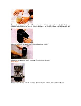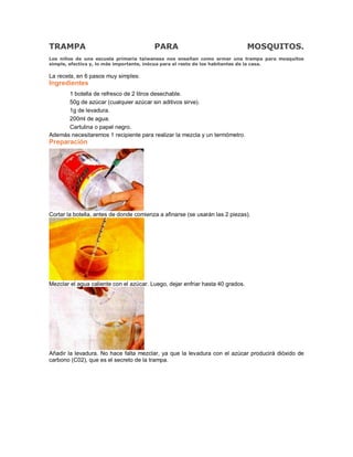 La trampa para mosquitos se hace con una botella de plástico cortada, azúcar, levadura y agua. Se mezcla el azúcar con agua caliente y luego se deja enfriar a 40 grados antes de añadir la levadura, que producirá dióxido de carbono. La parte superior de la botella se coloca invertida dentro de la base para que los mosquitos entren pero no puedan salir. Al cubrir la trampa con papel negro y colocarla en un rincón oscuro y húmedo, atraerá y quedará atrap