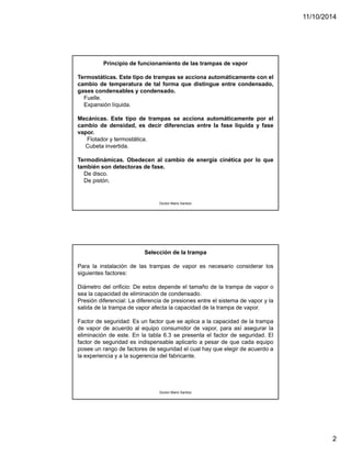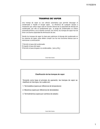El documento habla sobre trampas de vapor, dispositivos que permiten el drenaje de condensado y evitan la fuga de vapor. Explica que las trampas se clasifican en termostáticas, mecánicas y termodinámicas dependiendo de su principio de operación. También proporciona tablas para seleccionar el tipo de trampa apropiado dependiendo del diámetro, presión y capacidad requerida. Como ejemplo, calcula la trampa necesaria para un condensador que produce 5,000 lb/h de agua a 160°F
