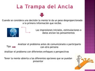 Este documento resume varios conceptos y sesgos cognitivos relacionados con la toma de decisiones. Menciona que las primeras impresiones suelen tener un peso desproporcionado, y que es importante considerar múltiples perspectivas antes de tomar una decisión. También señala que el cambio genera inseguridad pero es inevitable, y que es importante estar abiertos a opiniones objetivas ajenas al problema.