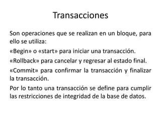 Este documento describe transacciones, procedimientos almacenados y el manejo de errores en bases de datos. Explica que las transacciones permiten agrupar operaciones usando comandos como "begin", "commit" y "rollback". También describe las propiedades de atomicidad, consistencia, aislamiento y durabilidad de las transacciones. Además, explica que los procedimientos almacenados permiten agrupar operaciones reutilizables y cómo declarar y ejecutar dichos procedimientos. Finalmente, detalla cómo manejar errores específicos usando declar