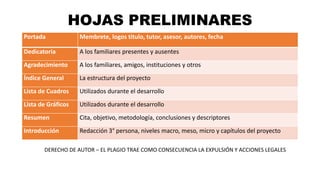 Este documento presenta la estructura de un proyecto de investigación. Describe las secciones principales que debe contener un proyecto como la portada, índice, resumen, introducción, descripción de la comunidad y situación problema, objetivos, justificación e impacto social esperado. El proyecto busca dar solución a una situación problema identificada en una comunidad mediante objetivos generales y específicos que beneficiarán tanto a miembros directos como indirectos de la comunidad.