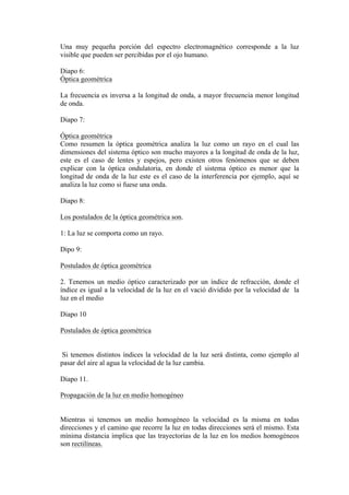 Este documento presenta una lección sobre óptica geométrica en 33 diapositivas. Explica conceptos clave como luz como onda electromagnética, propagación de la luz, índice de refracción, leyes de reflexión y refracción, espejos planos, parabólicos y elípticos, lentes convergentes y divergentes, y construcción de imágenes. El objetivo es proporcionar los principios básicos de óptica geométrica para entender el funcionamiento de lentes y espejos basados en un enfo