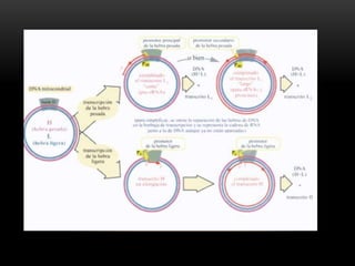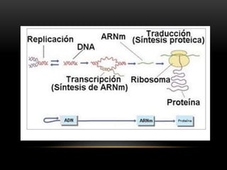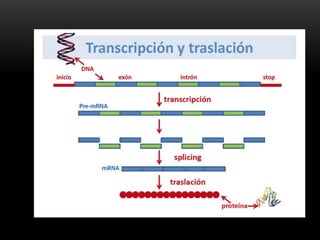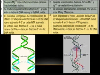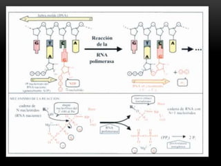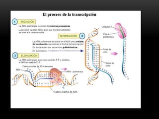Este documento describe el proceso de transcripción en organismos procariotas y eucariotas. Explica que la transcripción es catalizada por la enzima ARN polimerasa y consta de las etapas de iniciación, elongación y terminación. También describe los diferentes tipos de ARN polimerasas y los mecanismos de regulación de la transcripción mediante factores de transcripción y antibióticos.