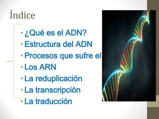 El documento describe los procesos de transcripción y traducción del ADN. Explica que el ADN contiene la información genética de los seres vivos y está formado por dos cadenas de nucleótidos en forma de doble hélice. El ADN sufre procesos como la replicación, transcripción y traducción. La transcripción copia la información del ADN al ARN mensajero. La traducción utiliza el ARN mensajero para sintetizar proteínas en los ribosomas.