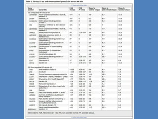 Este estudio evaluó el transcriptoma de la piel de pacientes con psoriasis en una gran muestra y lo comparó con estudios previos y modelos in vitro. Se identificaron 1326 genes regulados de manera diferencial entre la piel lesionada y normal, incluyendo 600 nuevos genes como S100A7A, THRSP y ELOVL3. Los genes más sobreexpresados fueron SERPINB4, PI3, DEFB4 y la familia S100, mientras que los más subexpresados fueron WIF1, BTC y CCL27. Las categorías sobreexpresadas se