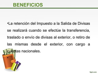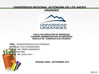El documento describe las transferencias electrónicas internacionales, incluyendo los beneficios como la retención del impuesto a la salida de divisas, la funcionalidad de realizar pagos electrónicos a través de bancos corresponsales, y los costos como una tarifa del 5% y límites de hasta $10,000 diarios. También incluye una opinión positiva sobre las transferencias electrónicas y enlaces a sitios web sobre el tema.