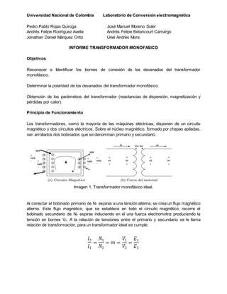 El informe describe un laboratorio sobre transformadores monofásicos, cubriendo objetivos como la identificación de bornes, determinación de polaridad y obtención de parámetros del transformador. Se presentan pruebas de caracterización, incluyendo ensayos de vacío y cortocircuito, para analizar pérdidas y calcular la relación de transformación. Finalmente, se concluye sobre la relevancia de la seguridad y la precisión en las mediciones durante dichos ensayos.