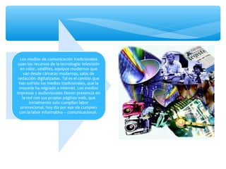 Este documento resume la evolución de los medios de comunicación desde los primeros medios como la piedra y el papiro hasta la imprenta de Gutenberg en el siglo XV. Luego describe cómo las tecnologías de la información y la comunicación han transformado radicalmente los medios con la aparición de Internet y las redes sociales, dando lugar al cyberperiodismo. Actualmente, los medios se han convertido más en redes sociales que en entornos de lectura, buscando una mayor participación del público a través de la publicación y el intercambio de contenidos.