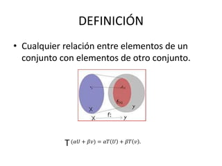 Una transformación lineal es cualquier relación entre elementos de un conjunto y elementos de otro conjunto que cumple ciertas propiedades. Las propiedades incluyen que la transformación de cero es cero, que la transformación de una combinación lineal de vectores es igual a la combinación lineal de las transformaciones de los vectores individuales, y que la transformación de un escalar por un vector es igual al escalar por la transformación del vector. Las transformaciones lineales se utilizan en álgebra lineal y tienen aplicaciones en diversas áreas.