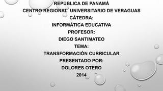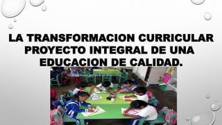 El documento trata sobre la transformación curricular como un proyecto integral para mejorar la calidad de la educación. Explica que la transformación curricular consiste en actualizar los enfoques, métodos y contenidos didácticos. También describe los principios de la transformación como la integralidad, flexibilidad e interdisciplinariedad. Finalmente, señala la necesidad de implementar nuevas ofertas académicas para que los estudiantes desarrollen capacidades y sean competitivos.