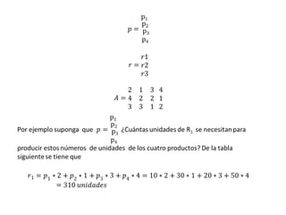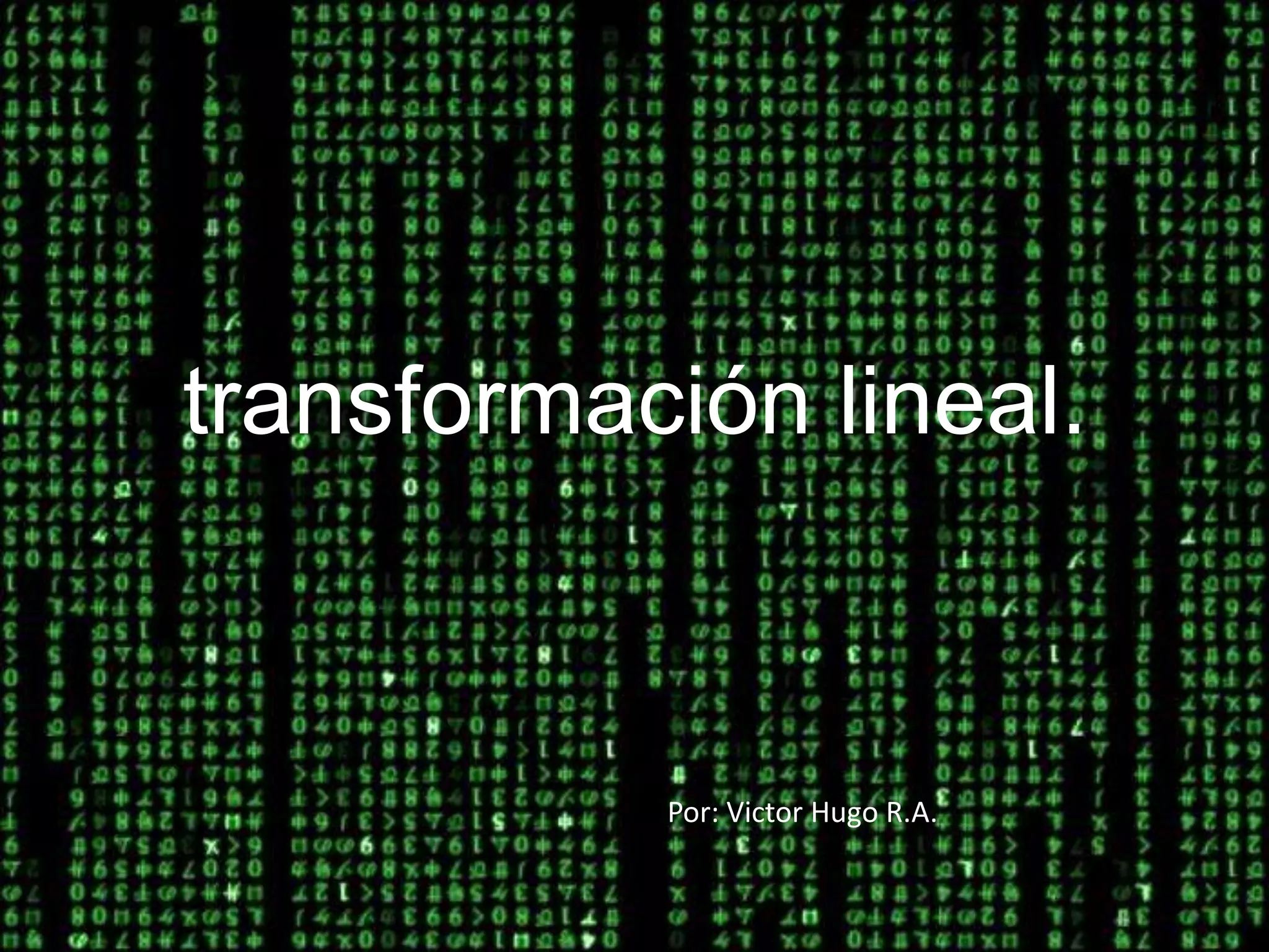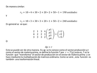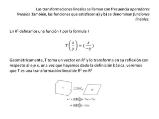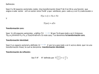 Este documento define las transformaciones lineales y sus propiedades, y proporciona un ejemplo de cómo una transformación lineal puede mapear un vector de producción a un vector de materias primas requeridas. Las transformaciones lineales conservan la suma vectorial y la multiplicación por escalar, y cualquier transformación lineal entre espacios vectoriales de dimensión finita puede representarse mediante una matriz.