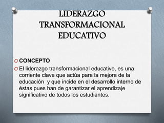 El liderazgo transformacional educativo es una corriente que busca mejorar la educación mediante la potenciación de las capacidades del personal y el aprendizaje organizativo. Este tipo de liderazgo promueve un enfoque carismático, inclusivo y participativo, diferenciándose de modelos más tradicionales, centrándose en el compromiso colectivo hacia la renovación de metas y valores. Además, se estructura en dimensiones específicas que fomentan la cultura colaborativa y la mejora continua en las organizaciones educativas.