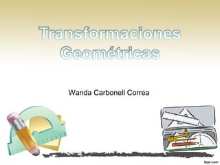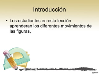 Este documento presenta una lección sobre las transformaciones geométricas de rotación, traslación y reflexión. Introduce los objetivos de identificar y reconocer estas transformaciones. Explica que una traslación es el movimiento de una figura sin cambiar su tamaño o forma, una rotación es girar una figura alrededor de un punto fijo, y una reflexión es la imagen especular de una figura. Incluye enlaces a demostraciones interactivas y ejercicios de práctica para que los estudiantes aprendan sobre estas transformaciones.