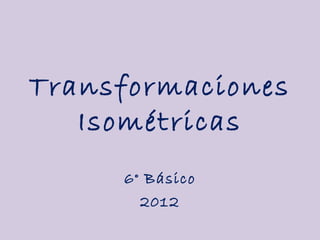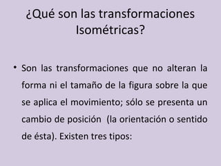 Las transformaciones isométricas son movimientos que cambian la posición de una figura sin alterar su forma o tamaño. Existen tres tipos: traslación, rotación e identidad. El teselado es el proceso de embaldosar una superficie con figuras regulares o irregulares sin dejar espacios vacíos ni superposiciones; un ejemplo común es el baldosado de pisos y paredes.