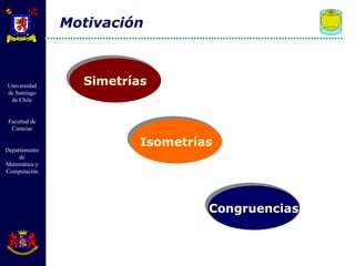 El documento describe diferentes tipos de transformaciones isométricas en geometría euclidiana, incluyendo traslaciones, rotaciones y reflexiones. Las traslaciones mueven cada punto de una figura por un mismo vector. Las rotaciones giran todos los puntos de una figura alrededor de un punto fijo. Las reflexiones crean puntos simétricos de cada punto a través de un eje. Estas transformaciones preservan distancias y ángulos.