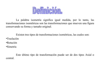 Este documento describe las tres transformaciones isométricas principales: traslación, rotación y simetría. La traslación mueve una figura sumando un vector de traslación a las coordenadas de sus puntos. La rotación gira una figura en ángulos múltiplos de 90° cambiando las coordenadas de sus puntos. La simetría puede ser axial alrededor de una línea de simetría o central alrededor de un punto de simetría, reflejando la figura.