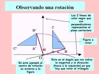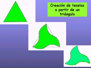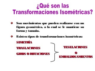 El documento describe las transformaciones isométricas, que son movimientos que mantienen la forma y tamaño de una figura geométrica. Explica los tipos de transformaciones isométricas como simetrías, traslaciones, giros o rotaciones, teselaciones y embaldosamientos. También describe los principios de las isometrías y define la teselación como el cubrimiento del plano con figuras que se repiten sin superponerse.