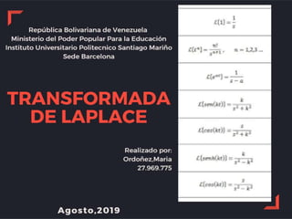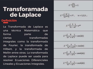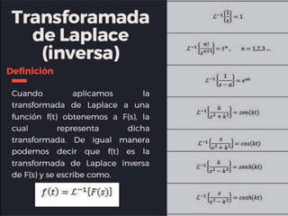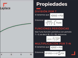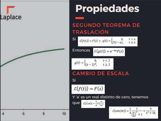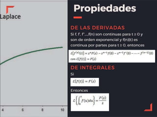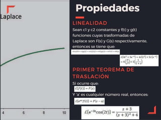 Este documento describe las propiedades de la transformada de Laplace y cómo se pueden usar para resolver ecuaciones diferenciales. Indica que la transformada de Laplace de una suma de funciones es igual a la suma de las transformadas individuales y que la transformada de Laplace de una constante multiplicada por una función es igual a esa constante multiplicada por la transformada de la función. También explica que la transformada de Laplace puede usarse para encontrar soluciones a ecuaciones diferenciales lineales de orden n.