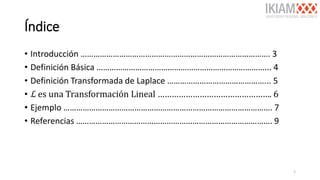 El documento aborda la transformada de Laplace, una herramienta matemática esencial para transformar funciones de una forma a otra. Se presentan definiciones clave, propiedades de linealidad y ejemplos de cálculos, así como la convergencia de integrales. También se mencionan referencias relevantes para un estudio más profundo del tema.