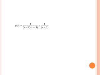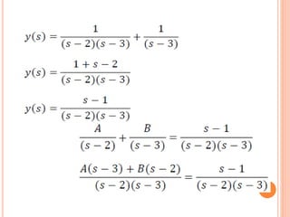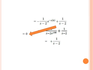 Este documento describe cómo resolver una ecuación diferencial utilizando el método de la transformada de Laplace. Se aplica la transformada de Laplace a ambos lados de la ecuación diferencial y(t) - 3y = e^2t con la condición inicial y'(0) = 1. Esto resulta en una solución algebraica para y en términos de s. Luego, se asignan valores convenientes para los parámetros y se aplica la antitransformada de Laplace para obtener la solución cuando t = 0.