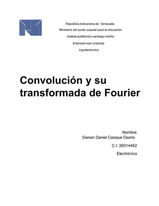El documento trata sobre la convolución y la transformada de Fourier. Explica que la convolución de dos funciones produce una tercera función que representa la superposición de una función y una versión trasladada e invertida de la otra. También indica que la transformada de Fourier de una convolución es igual al producto punto a punto de las transformadas individuales. Luego describe algunas aplicaciones de la convolución y la transformada de Fourier en áreas como óptica, acústica e ingeniería.