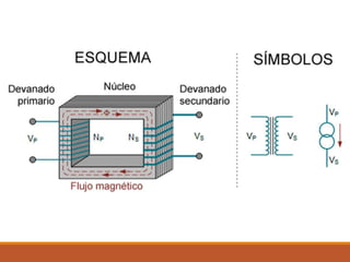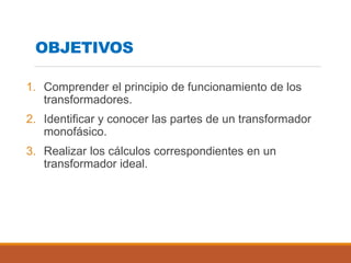 El documento describe el funcionamiento y partes de un transformador monofásico. Explica que los transformadores funcionan mediante inducción electromagnética y permiten aumentar o disminuir la tensión y corriente de un circuito de corriente alterna manteniendo la frecuencia y potencia constante. Detalla las partes clave de un transformador, como el núcleo, devanados primario y secundario, y cómo los transformadores pueden ser reductores o elevadores dependiendo de su relación de transformación.