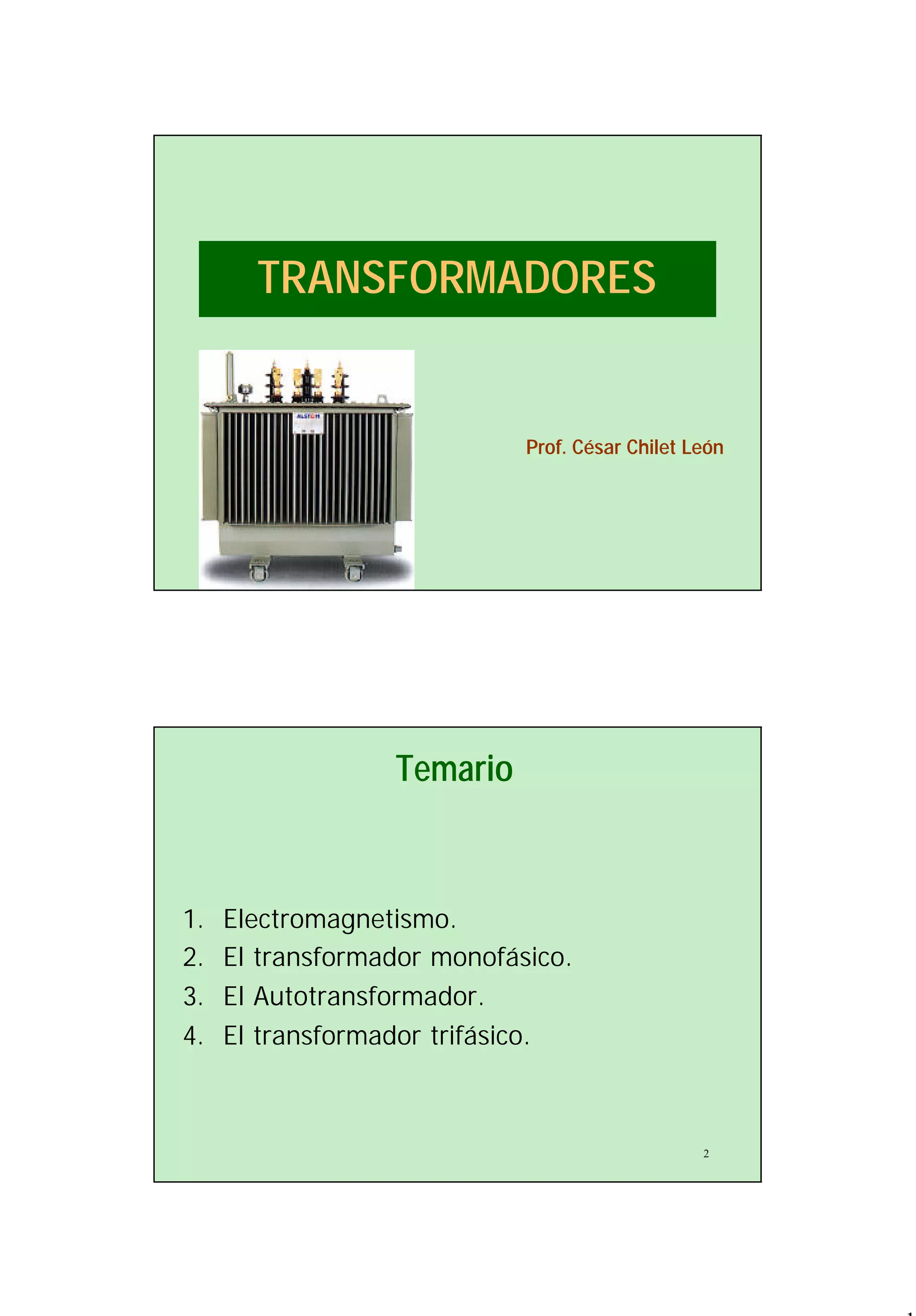 1. El documento presenta información sobre transformadores, incluyendo electromagnetismo, tipos de transformadores (monofásicos, trifásicos, autotransformadores), conexiones, y conceptos técnicos como pérdidas y ensayos.