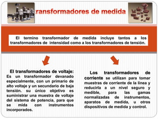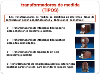 Los transformadores de medida incluyen transformadores de intensidad y tensión, los cuales reducen los niveles de corriente y voltaje a valores seguros y medibles. Se clasifican según su construcción y aplicación, como transformadores de intensidad de soporte o bushing, y transformadores de tensión de un polo o para servicio exterior. Los más importantes son los transformadores de medida para instalar instrumentos, contadores y relés protectores en circuitos de alta tensión o intensidad, aislando estos circuitos de medida para permitir una mayor normalización.