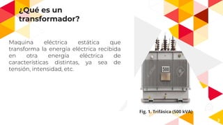 El documento describe los componentes y funcionamiento básico de un transformador eléctrico. Un transformador transforma la energía eléctrica de una tensión a otra mediante el uso de devanados primario y secundario y un núcleo magnético. El documento también explica los sistemas de aislamiento, clasificaciones, fallas comunes y técnicas de mantenimiento para transformadores.