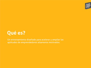 Este documento describe un entrenamiento para emprendedores que busca acelerar y ampliar sus aptitudes a través de módulos impartidos por expertos. El objetivo es que los participantes obtengan herramientas y competencias para el desarrollo de sus proyectos empresariales y personales. El programa incluye varios fines de semana con diferentes temas como innovación social, modelos de negocio, contabilidad e impuestos, entre otros.