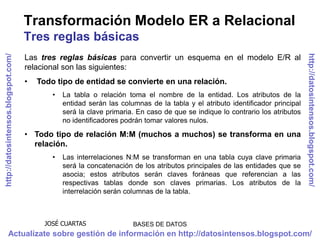 Este documento describe las reglas para transformar un modelo entidad-relación (ER) a una base de datos relacional. Las tres reglas principales son: 1) cada entidad se convierte en una tabla con su clave principal; 2) cada relación muchos-a-muchos se convierte en una tabla; 3) cada relación uno-a-muchos o uno-a-uno se convierte propagando la clave principal. También explica cómo transformar atributos como multivaluados, derivados y alternativos.
