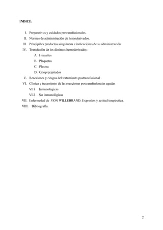 Este documento presenta las guías para la transfusión de hemoderivados en urgencias. Describe los preparativos y cuidados pretransfusionales, las normas de administración, los principales productos sanguíneos y sus indicaciones, el procedimiento para la transfusión de concentrados de hematíes, plaquetas, plasma y crioprecipitados, así como las reacciones y riesgos postransfusionales agudos.